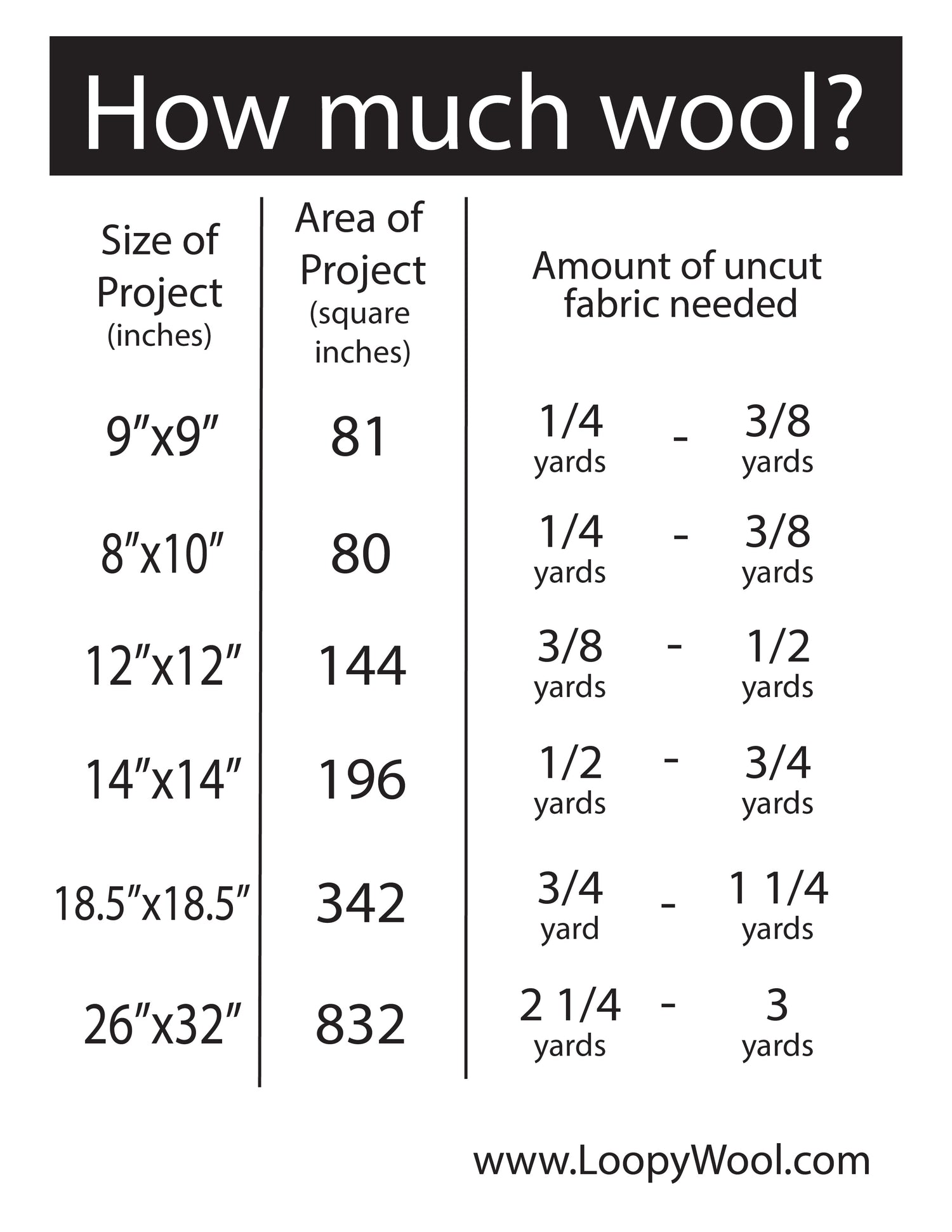 There are several factors that impact how much wool you'll need for a rug hooking or punch needle project, including the height of the hooking/punching, amount of wastage, how tightly loops are packed, and size of the project.